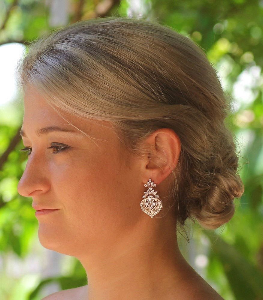 'Taylor' Rose gold Jewelry set of matching earrings and bracelet has been created for a ready to go set. Chic and elegant, the rose gold crystal bridal earrings have been designed in a Deco chandelier style, and the 'Taylor' bracelet is all crystal for a complete look. We have made them using the highest quality Swarovski zircon crystals, which have the most sensational sparkle and look like real diamonds.